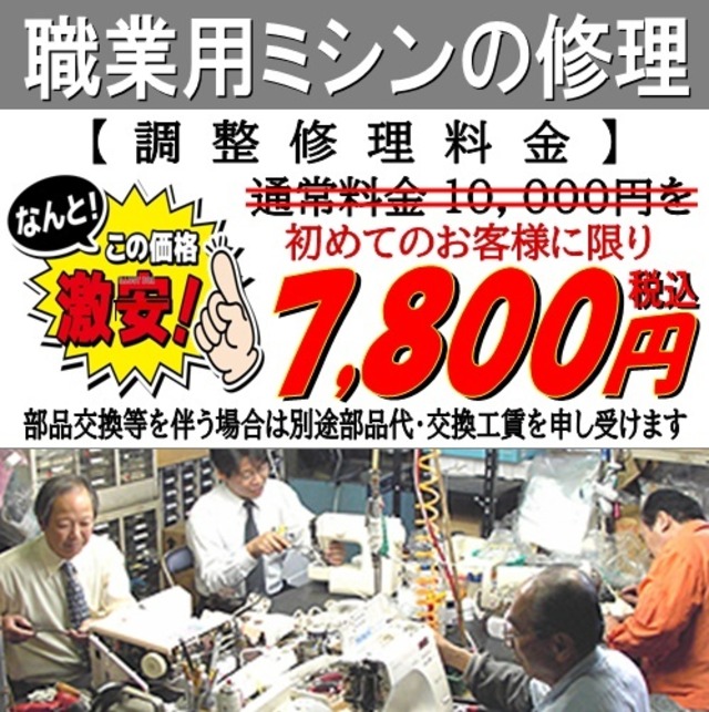 ┏★☆★☆━━━━━━━━━━━━━━━┓ あ な た の ミ シ ン の 修 理 屋 さ ん で す ┗━━━━━━━━━━━━━━━☆★☆★┛ 【 ミ シ ン 修 理 技 術 料 金 】 調整修理 ( 出張込 ) ⇒ 11,500円 (税込) を ▼ \初回お客様に限り⇒ 9,800円 (税込) / ※注) 部品交換を伴う場合は別途申し受けます。 ※注) 分解は修理スタッフにお尋ねください。 ※注) 修理不可能な場合は料金は頂きません。 _/_/_/_/_/_/_/_/_/_/_/_/_/_/_/ 調整修理は部品交換を伴わない修理で分解や 外装カバーの取外しを行わない簡易修理です。 ご指定のご住所へ地域担当の修理スタッフが、 迅速にお伺いして親切丁寧に調整いたします。 作業時間は最短で約30分で終了いたします。 ※注) 重度の場合はお預かり修理となります。 +++★ 早くて、安くて、安心、便利です ★+++ ◎ 部品交換などが必要な場合は、お見積りを いたしますので、ご検討された上で 部品交換を行いますのでご安心ください。 ◎ オーバーホールも別途承りますので、 詳しくは修理スタッフにお尋ねください。 _/_/_/_/_/_/_/_/_/_/_/_/_/_/_/ .